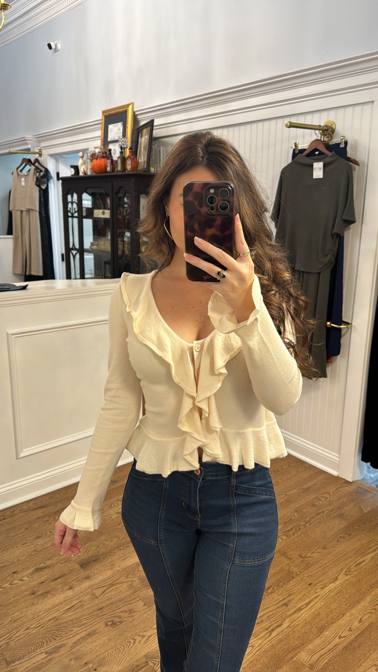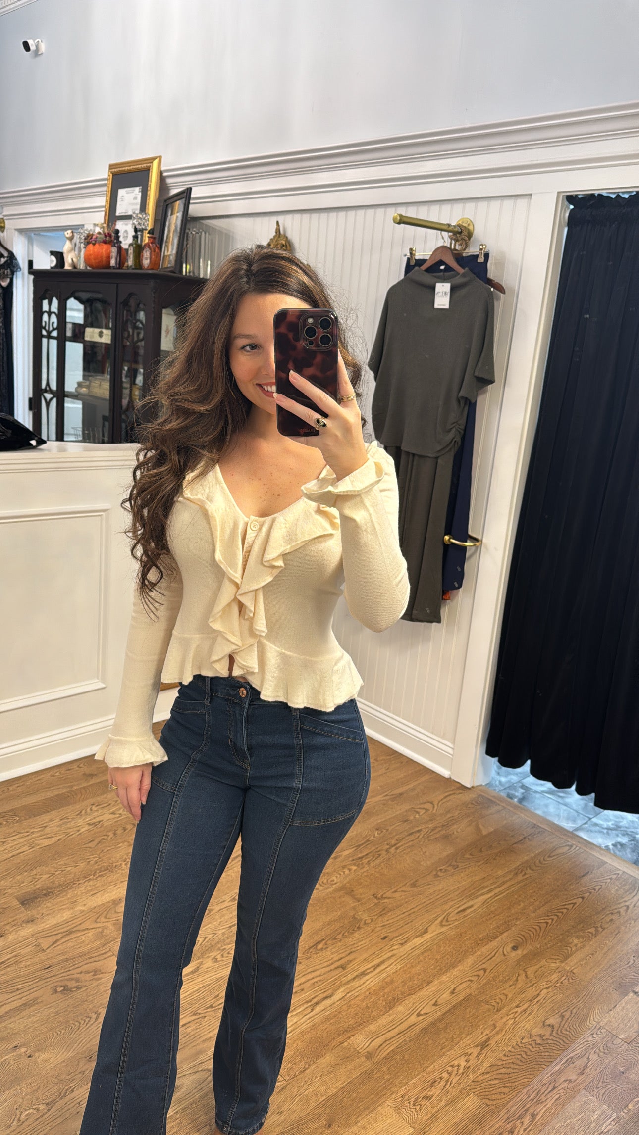 Elevate your wardrobe with the Buttercream Belle, a cream long sleeve sweater featuring a flattering V-neck and delicate ruffled trumpet sleeves. Its soft fabric and elegant design make it perfect for cozy yet stylish days.