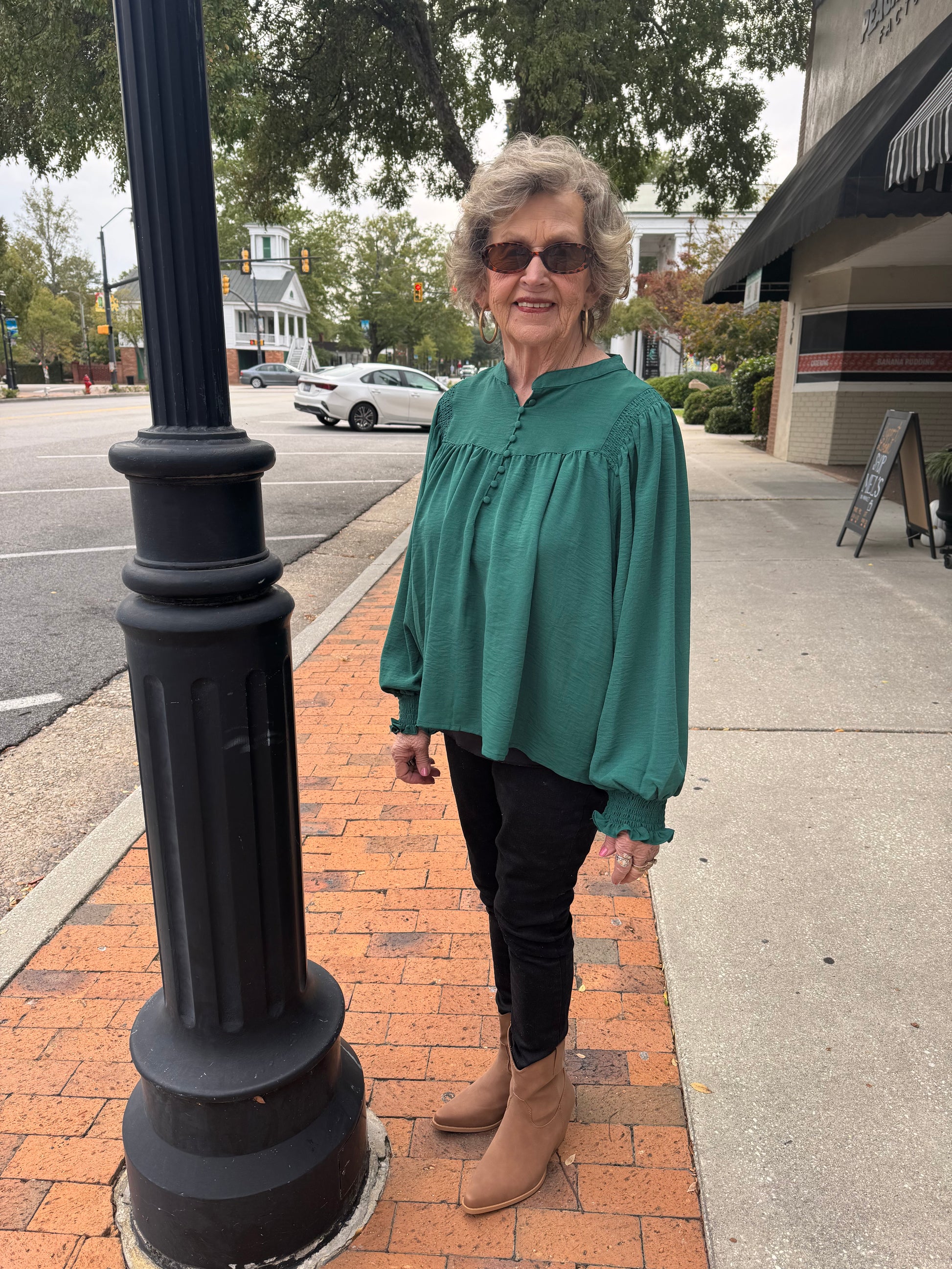 The Evergreen Top features delicate smocked detailing and long sleeves for a comfortable, stylish fit. Its button-up design adds a classic touch, perfect for both casual and polished looks.