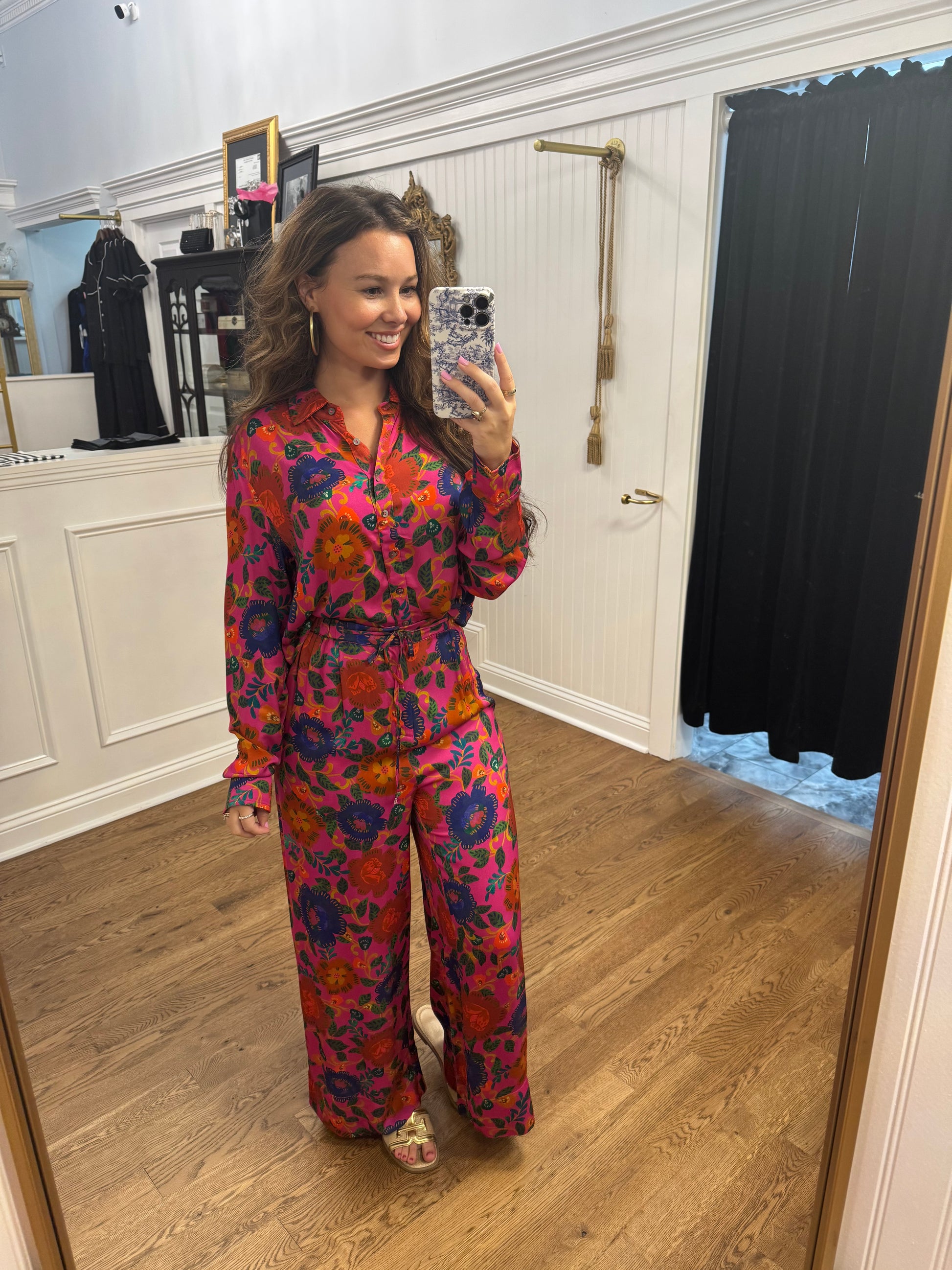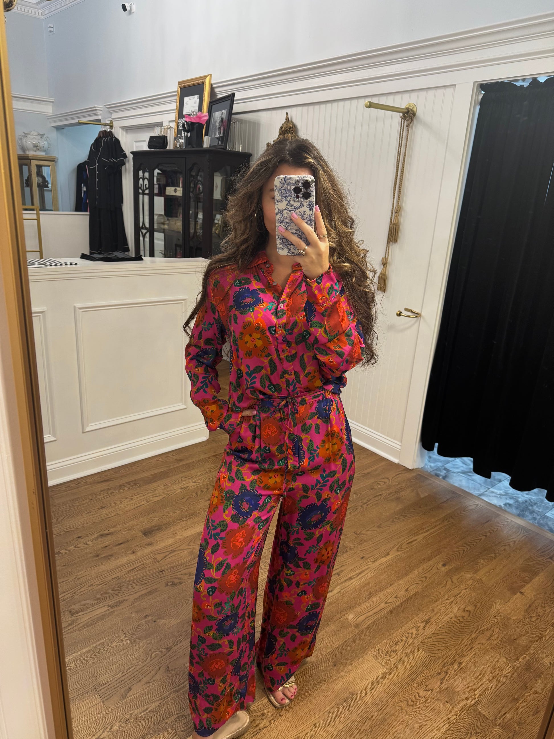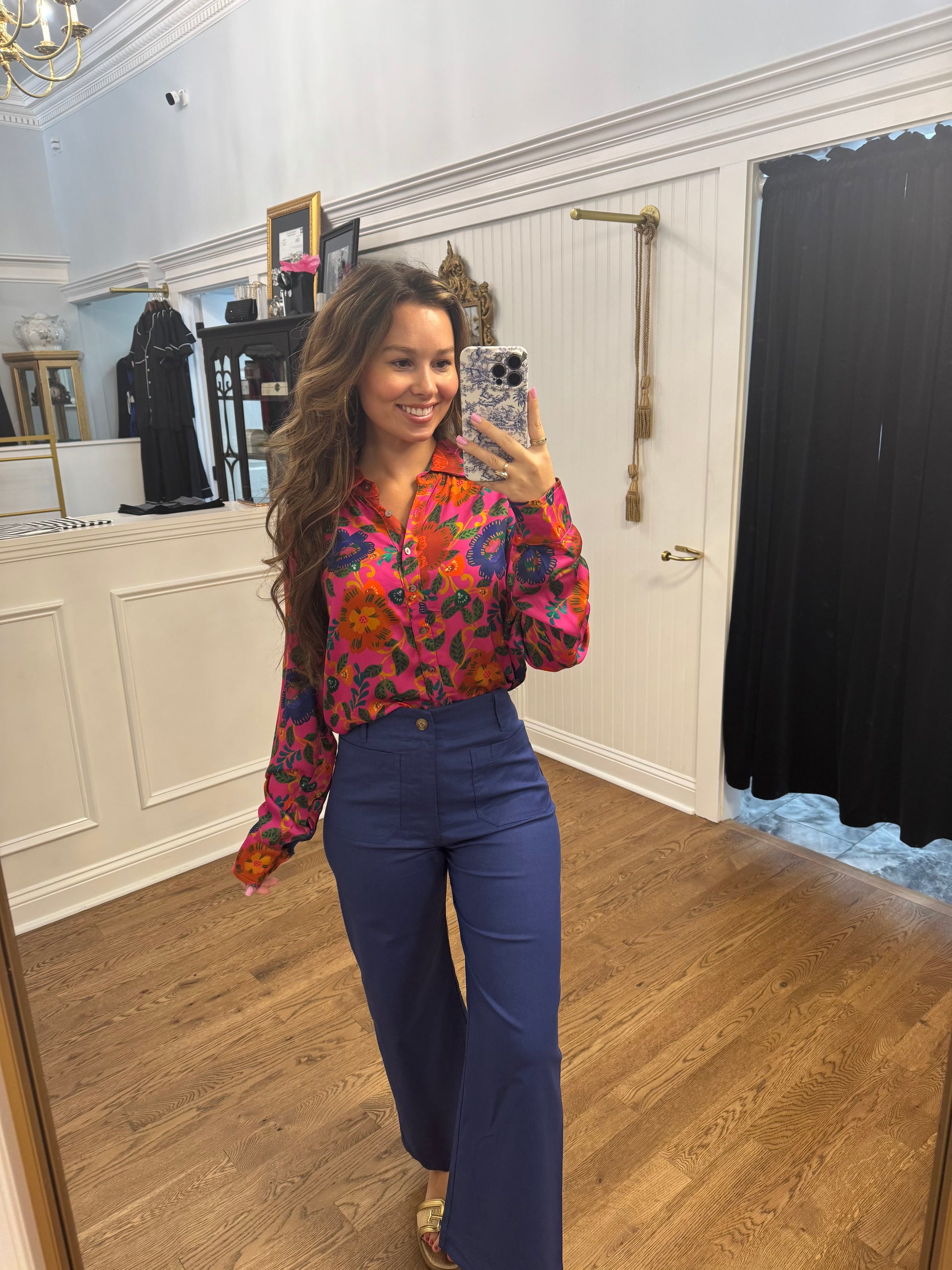 The Farah Top features a stunning fuchsia floral design, adding a pop of color to any outfit. With a classic collar, button-up front, and long sleeves, this top is perfect for both casual and formal occasions.