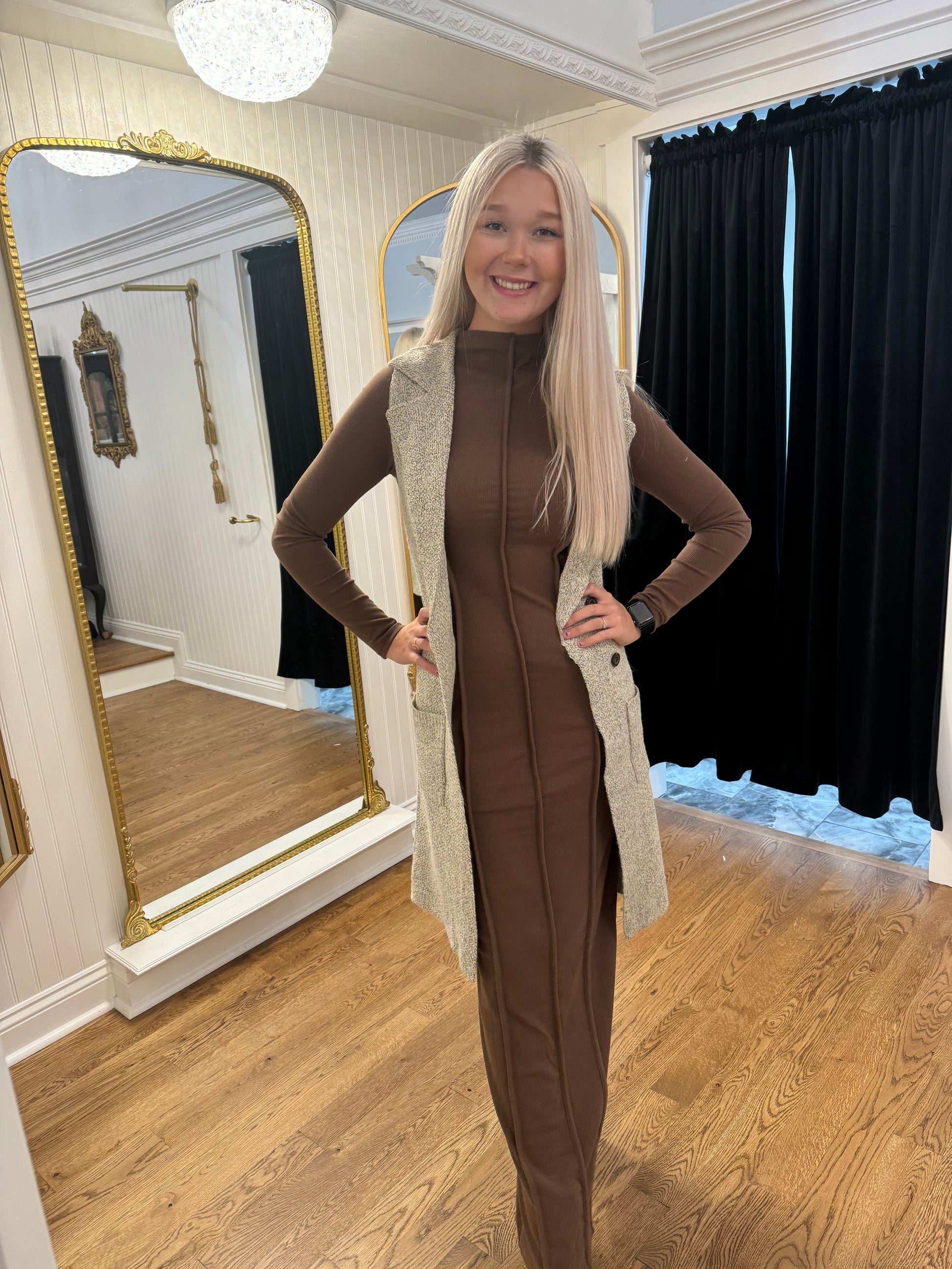 Wrap yourself in cozy warmth with our Karla Cardigan! This sleeveless long cardigan doubles as a vest coat, giving you versatility and style. The chic oatmeal color and button details add a touch of elegance. Perfect for any occasion, this cardigan is a must-have for your wardrobe.