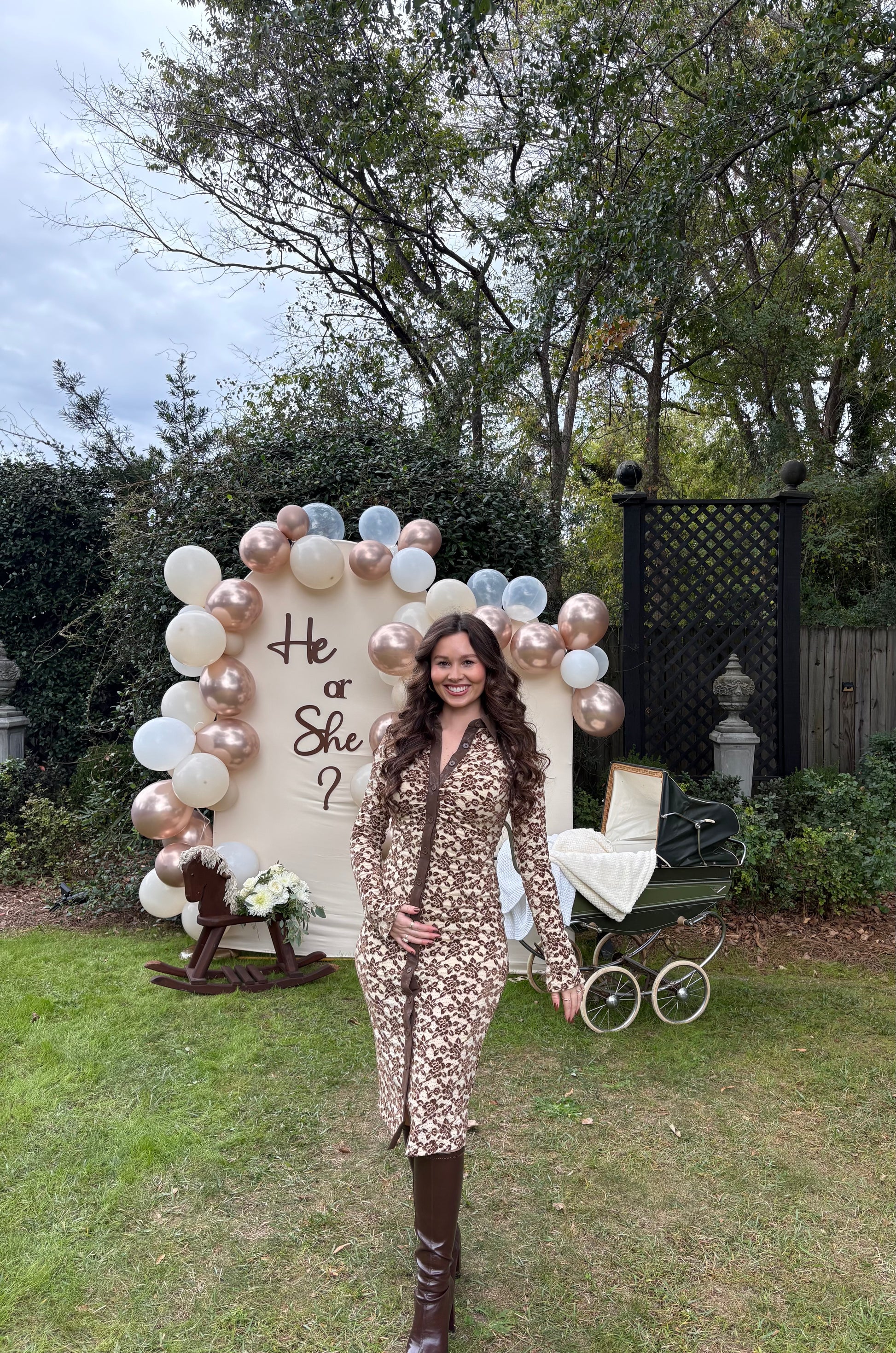 - Allover flocked brown floral pattern on a cream base - Body-hugging fit with midi length for a flattering silhouette - Classic shirt collar neckline with faux leather detail - Long sleeves with extended cuffs for a sleek look - Full-length front button closure with faux leather placket - Slight stretch in fabric for ease of movement