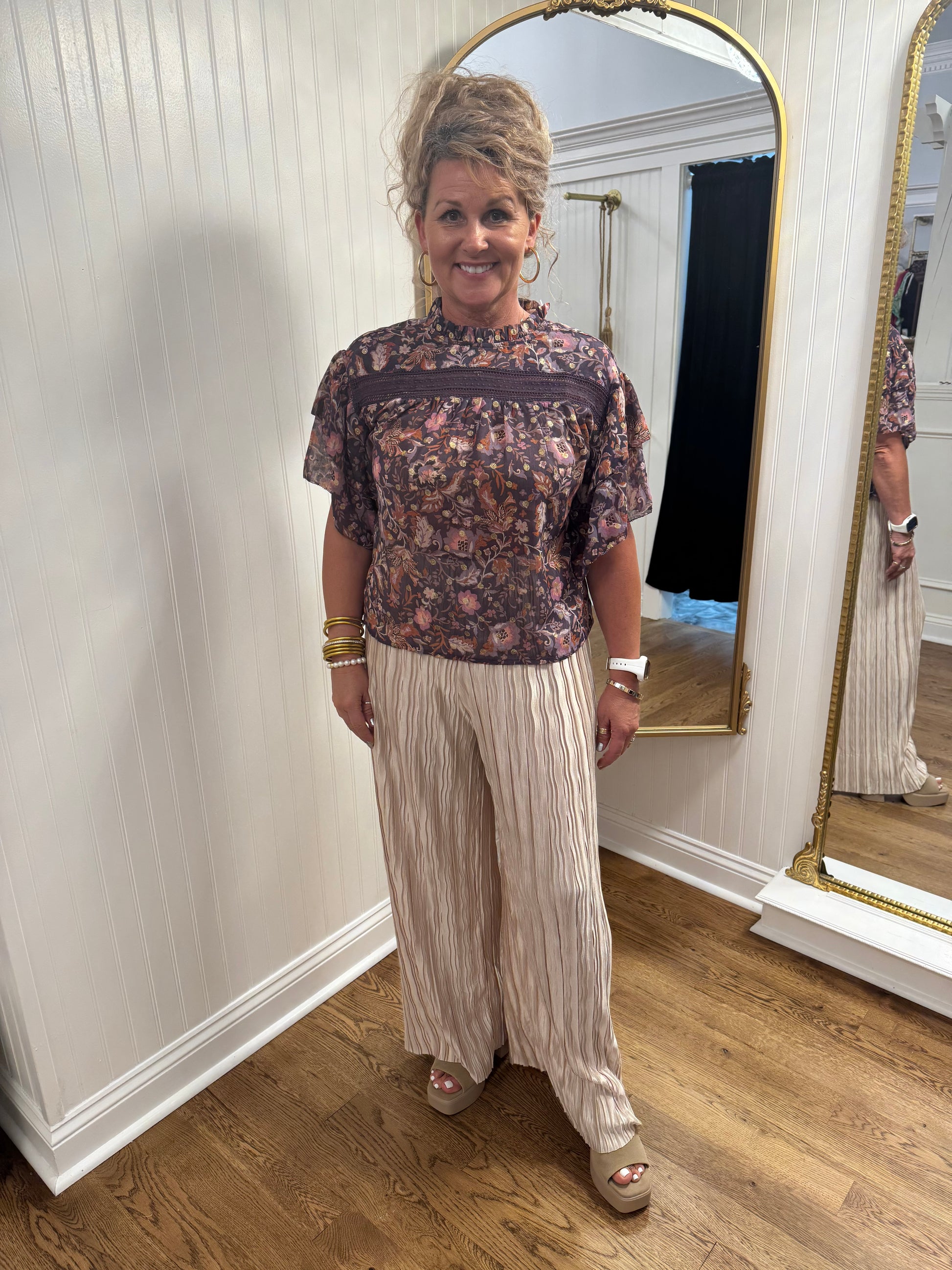 Introducing the Viola Top - the perfect blend of elegance and style. Featuring 1/2 ruffle sleeves with a black button closure, this top is adorned with a beautiful dark purple and blush floral pattern. Enhance your wardrobe with this statement piece.